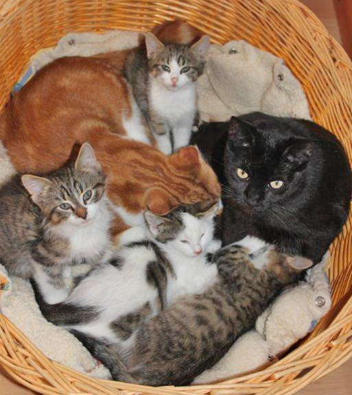 «Blacky und ein paar ihrer Adoptivkinder. Der rote Kater Felix kam als einzig überlebendes Baby mit zirka fünf Wochen zu uns. Seine Mutter war wohl verunfallt, seine Geschwister verhungert.»